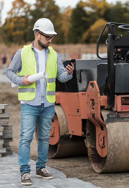Temel tabakası yapımı, asfalt serme, asfalt sıkıştırma, kalıp ve beton serimi.